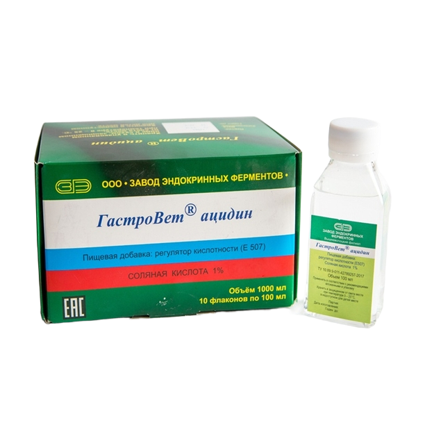 ГастроВет® ацидин - Пищевая добавка, регулятор кислотности (Е 507), соляная кислота 1,0%. ГастроВет® энзим - Соль поваренная пищевая «Экстра», пепсин птичий